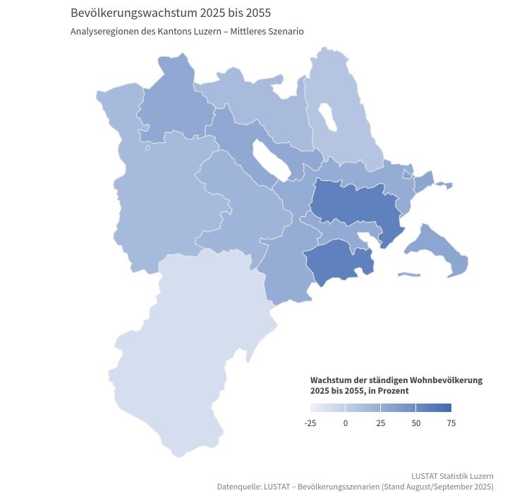 Im gesamtschweizerischen Vergleich wächst der Kanton Luzern damit überdurchschnittlich stark. Während für die Schweiz insgesamt bis 2055 ein Bevölkerungswachstum von rund 15 Prozent erwartet wird, liegt der prognostizierte Zuwachs im Kanton Luzern mehr als doppelt so hoch. Luzern gehört damit zu den wachstumsstärkeren Kantonen der Schweiz.