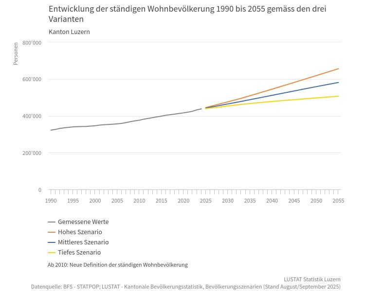 Die Bevölkerungsentwicklung im Kanton Luzern steht in den kommenden Jahrzehnten vor einem markanten Wachstum. Gemäss den aktuellen Bevölkerungsszenarien des Luzerner Statistikamts (LUSTAT) wird die ständige Wohnbevölkerung deutlich zunehmen und sich bis ins Jahr 2055 stark verändern. Ende 2024 lebten rund 438 000 Menschen im Kanton Luzern. Nach dem mittleren Szenario dürfte diese Zahl bis 2055 auf rund 581 600 Personen anwachsen. Dies entspricht einem Zuwachs von gut 30 Prozent innerhalb von rund 30 Jahren. Die Marke von 500 000 Einwohnerinnen und Einwohnern wird voraussichtlich bereits vor 2040 überschritten.
